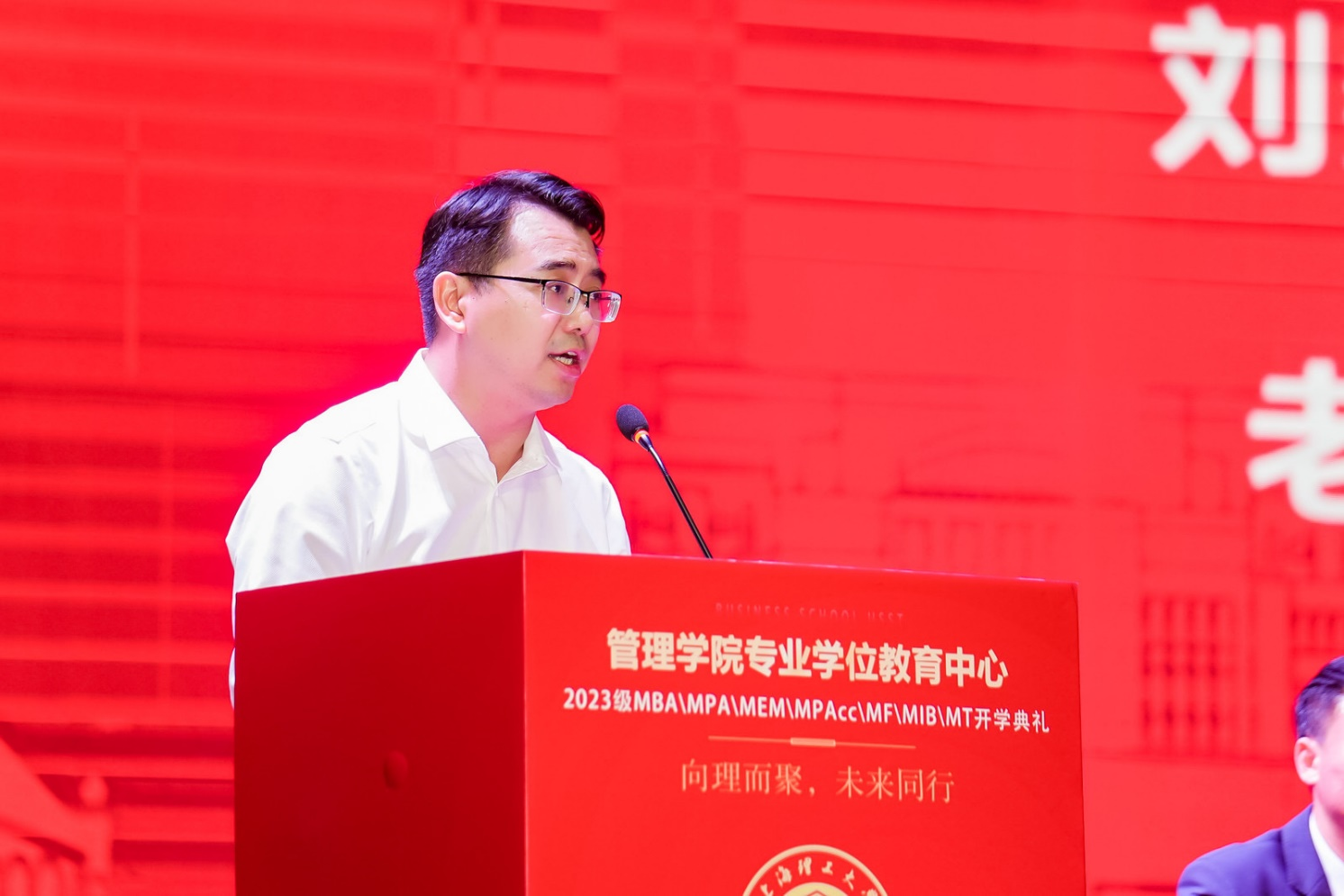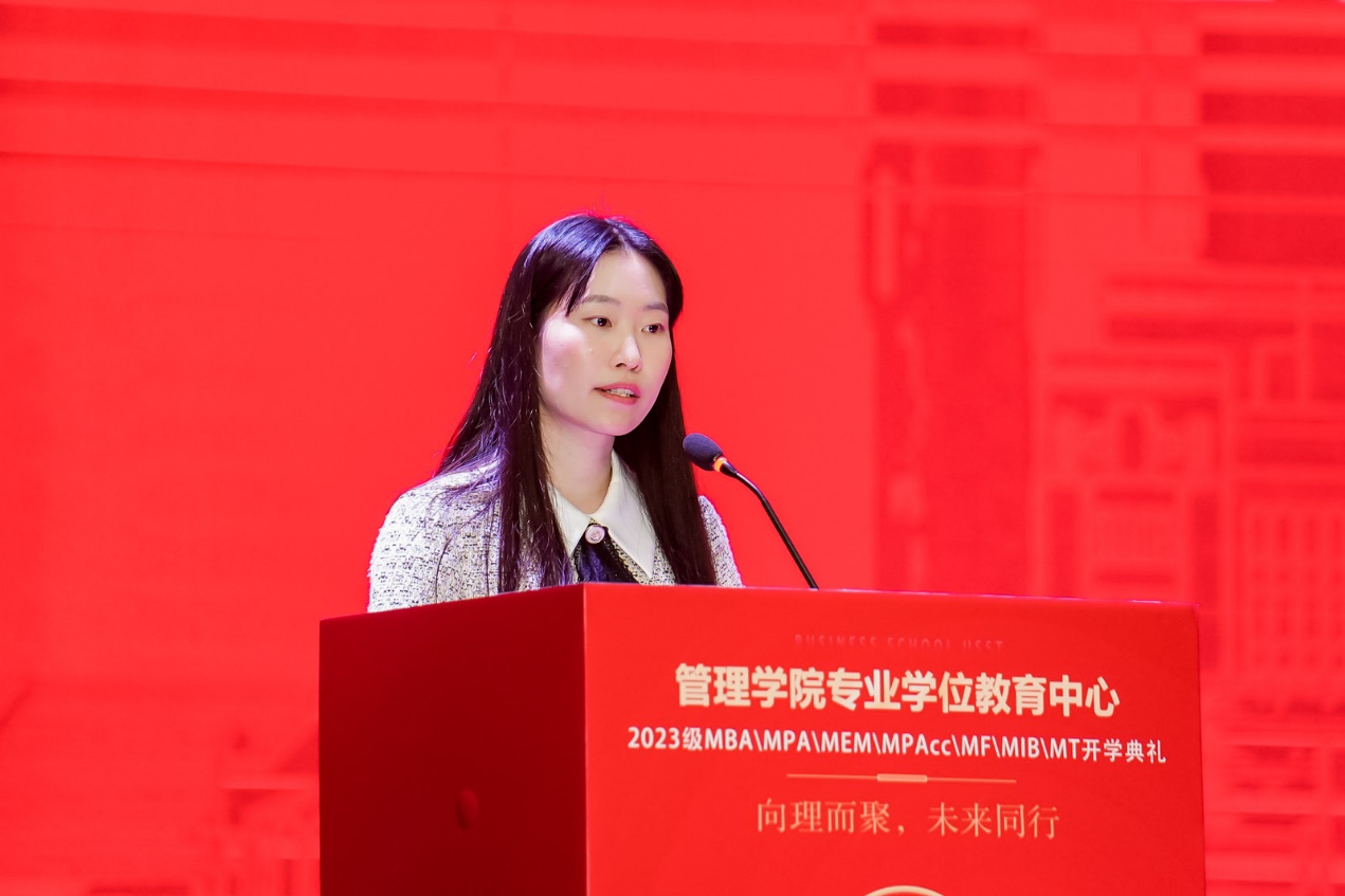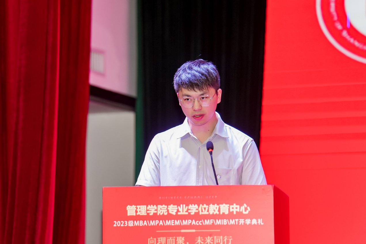 鲜衣怒马少年时,不负韶华行且知。23级MBA新生代表赵蒋奇发言时表示,如果自己是一辆汽车,那么MBA就是他的加油站。在这个加油站里,将遇到各种不同的人,大家都有一个共同的目标,让自己未来的人生旅途更加充实顺畅。接下来的学习中,他会直面挑战,不断探索创新,“相信自己还有无限潜能。”