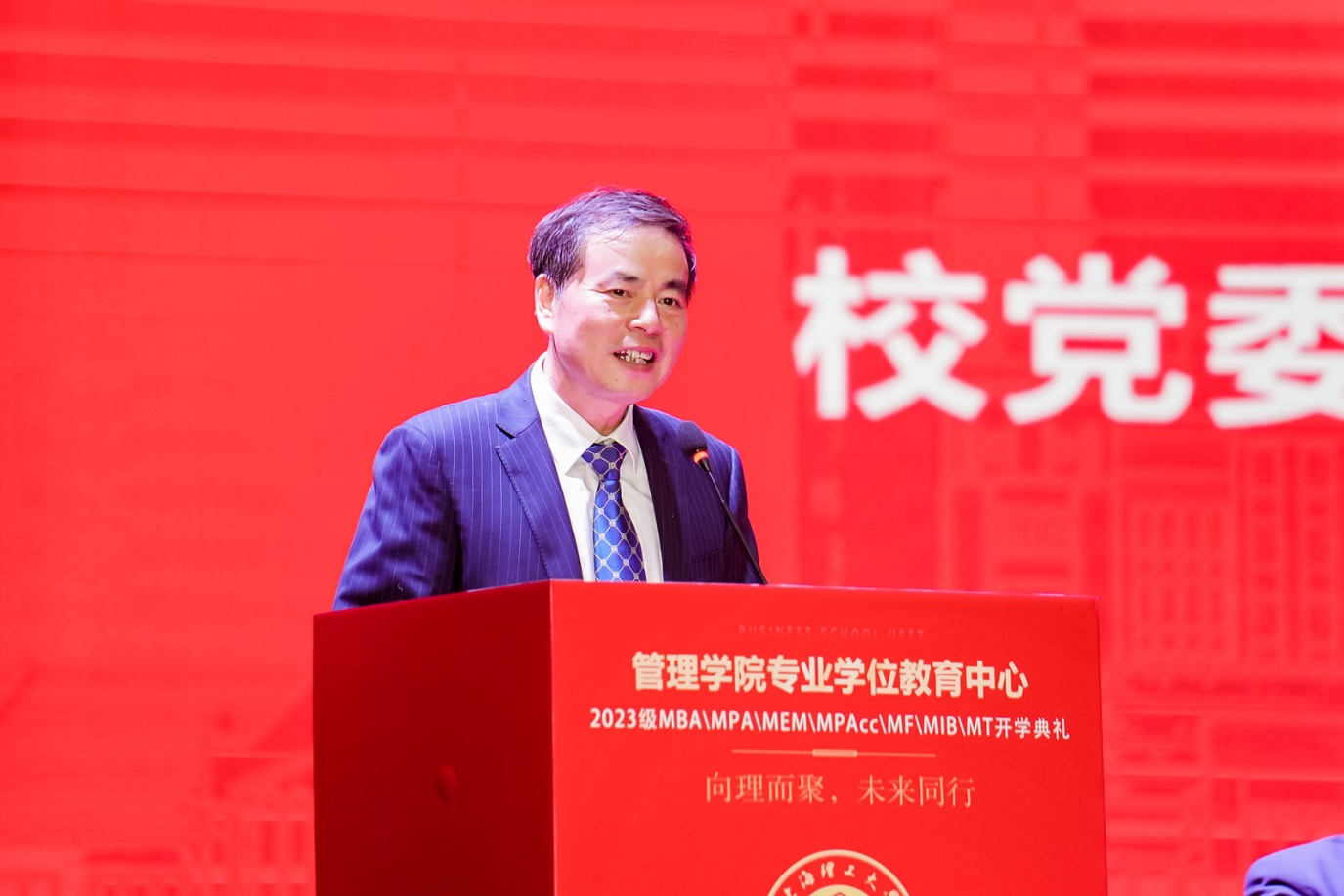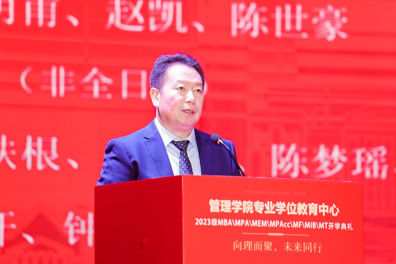 赵来军在致辞中回顾了管理学院成立以来的历史成绩,展望学院未来发展方向。他与同学提出三点建议,一是描绘蓝图,规划人生。在学习阶段,要明确目标,才能成就非凡成绩。二是笃实好学,追求卓越。希望同学们通过两年学习积累,实现自我超越。三是团结友爱,合作共赢。“利他”是商业的起点,合作共赢才会有更多机遇。