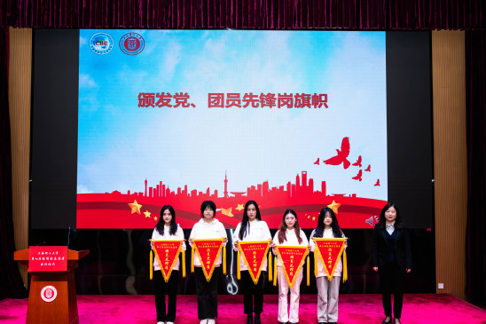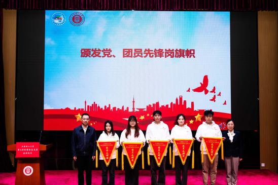 学工部副部长、学生处副处长刘伟,研工部副部长、研究生院副院长王张琦,教务处副处长李凌为进博会党、团员先锋岗志愿者代表颁发先锋岗旗帜。