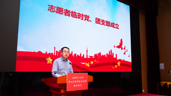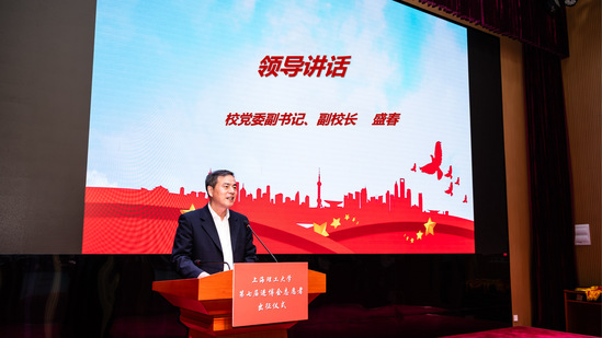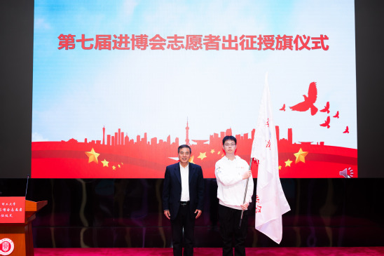 盛春为志愿者出征授旗并做动员讲话,他代表学校党委向参与第七届进博会志愿服务工作的老师和同学们表示由衷的感谢和亲切的慰问,他向全体志愿者提出三点希望:一是在志愿服务中坚定理想信念,二是在岗位实践中担当作为历练成长,三是学思践悟中激发向上向善力量。同时,他鼓励“小叶子”们继续弘扬“奉献、友爱、互助、进步”的志愿服务精神,以最完善的知识储备、最良好的精神面貌,延续上理青年志愿服务品牌,为上海再次举办一届成功、精彩、难忘的世界性盛会贡献青春力量!