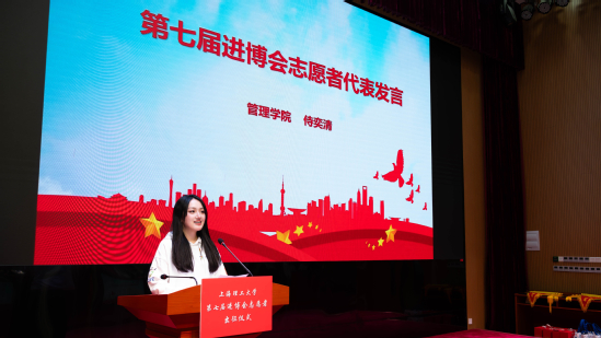 管理学院的“小叶子”侍奕清作为第七届进博会志愿者代表发言,讲述她与进博的相遇。她表示,进博会志愿服务是展现青年学子风采与担当的壮丽征程。她将全力以赴、尽心尽责地投入到志愿服务工作中,“在进博会服务中领悟国之大者,展现青春担当,勇挑重担、增长才干,与进博共成长,为青春留华彩。”这不仅是她对自己的期望,也将是全体上理“小叶子”对自己的要求!