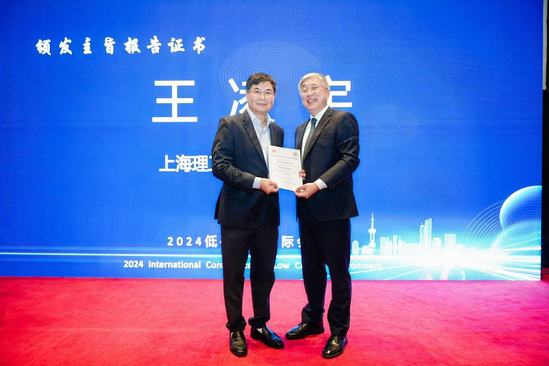 王凌宇(右一)为窦世学颁发主旨报告证书