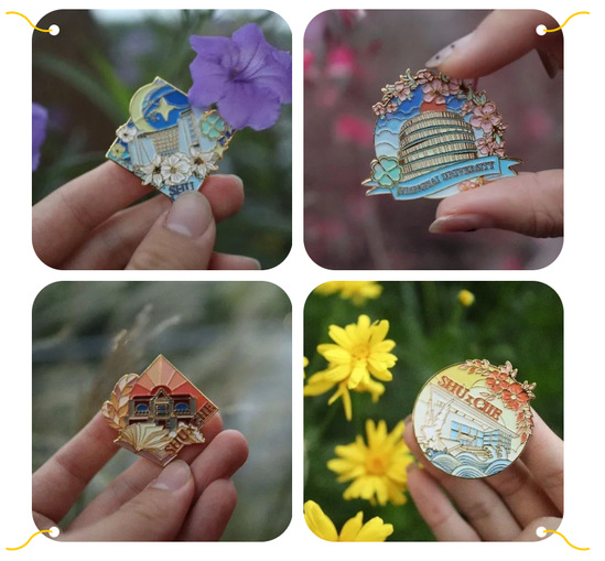 上海大学今年进博文创徽章共四枚,结合了上海大学经典建筑与进博会的四叶草元素,融合诠释了在日夜光影下“自强不息,道济天下”的校训精神。这一系列徽章是对上海大学美丽校园的展示每一枚都如同一幅精美的画卷,讲述着上海大学不同时刻的故事,承载着上海大学独特的文化精神,激励着每一位“小叶子”在进博的舞台上发光发热