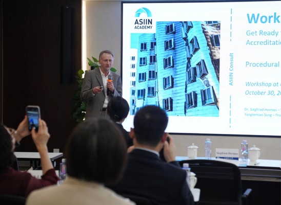 之后,ASIIN高级项目经理、资深培训师胡默尔斯先生(Dr. Siegfried Hermes)就认证程序的过程、同行评审原则进行了深入讲解,并借助最新通过认证的实证案例和与会人员就自评报告撰写的注意点等进行了分析,详细解读了报告中关于专业培养目标、培养要求、培养方案、专业师资、就业质量等内容的侧重点。在互动交流环节,大家在中德专业差异、学分转化等方面展开了积极讨论。