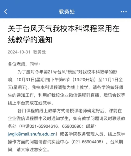 沪上东北片区的高校也发出通知,部分课程改为线上教学。上海财经大学教务处发布课程调整通知:为了应对今年第21号台风“康妮”对学校本科教学的影响,10月31日(星期四)下午第6节(13:20开始)至11月1日全天(星期五),学校本科课程调整为线上教学,请各学院做好师生的通知工作,利用好企业微信课程群直播、腾讯会议等线上平台完成在线教学。