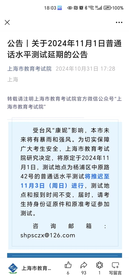 此外,同在杨浦区的上海市教育考试院发布公告,原定11月1日的普通话水平测试延期。公告称,为切实保障广大考生安全,院方研究决定,将原定于2024年11月1日,测试地点为杨浦区中原路42号的普通话水平测试将推迟至11月3日(周日)进行,测试地点和报到时间不变。届时,请考生持身份证原件和原准考证参加测试。
