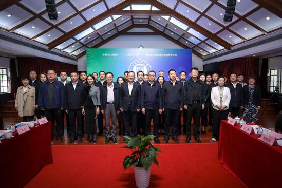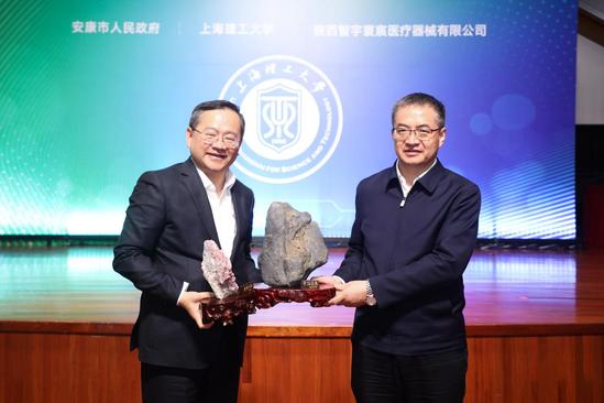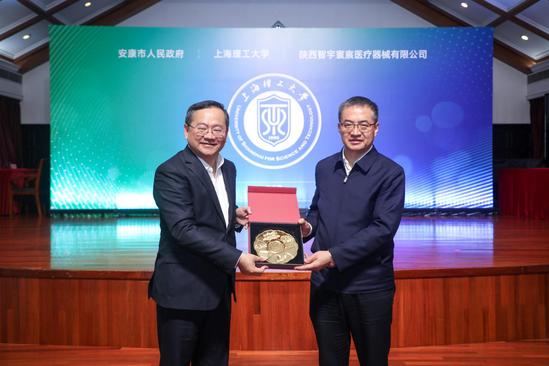 会议伊始,在朱新远、王浩、周孝斌、庄松林、蔡永莲、张治年的见证下,沪江学院陈红、安康市工业和信息化局局长张志群、上海智宸实业(集体)有限公司总经理朱雯迪作为三方代表进行了智宸-沪江医疗研究院签约仪式。
