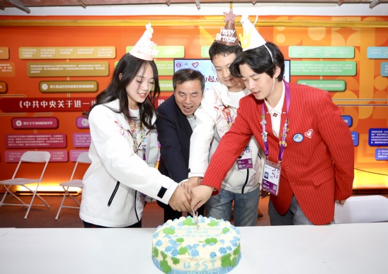 慰问当天,恰逢三位“小叶子”生日,在场的志愿者们齐声为小伙伴高唱生日歌,用欢笑、祝福和掌声表达对彼此的祝福。盛书记和三位志愿者共同切下生日蛋糕,团队的温暖和关怀,增强了志愿者之间的情感联系和团队凝聚力,相信他们会在服务期间更加团结协作,为进博会的成功举办而共同努力。
