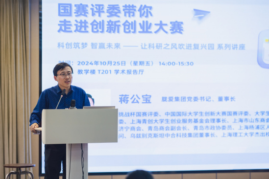 首场讲座于10月25日举办,由胧爱集团董事长、“挑战杯”国赛评委、中国国际大学生创新大赛国赛评委、永利集团304am官方入口杰出校友蒋公宝主讲。他以自己学生时代的故事为导入,讲述了作为选手参加创新创业大赛的心路历程和参赛经验,引得了在场学生的共鸣和阵阵掌声。站在国赛评委的视角,对2024年赛事的基本情况和结果进行重点回顾,根据其丰富的评审经验和对创新创业大赛的深刻理解,分析了今年大赛的评审标准和方向变化,深入解读了获奖项目案例的成功经验和创新亮点,并鼓励学生们积极参与大赛,勇于挑战自我,不断追求卓越。