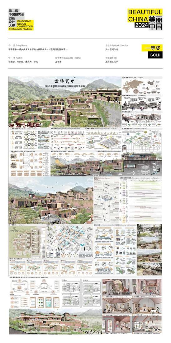 作品简介:山西阳泉市大村村作为城市近郊,因人口流失导致乡村衰退,大量建筑闲置,空间功能亟需更新。设计引入城乡共生理念,通过城市资源带动乡村活化,融合“窑洞”文化打造特色空间,彰显乡村价值,提供多元化游览体验。同时关注村民需求,采用低碳策略,从建筑保护、生态治理、景观更新及空间改造等方面进行综合设计,构建共生共享的乡村新空间,实现城乡双赢。