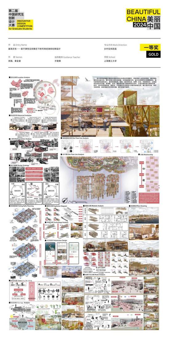 作品简介:疍家文化是中国沿海地区独特的文化现象,具有深厚的历史底蕴和独特的生活方式。随着现代化进程的加快,疍家文化面临着传承与发展的挑战。本次设计通过模块化渔排改造以及周边环境提升,增加功能空间,提升疍家人的生活质量,同时传承和发扬疍家文化。设计将⽣活、经济、⽂化、科技相结合,以疍家⺠⻛⺠俗为灵感,将渔歌、龙舟、婚俗等传统习俗转译到空间中,打造全新的复合渔排社群,并利⽤新科技、新技术,打造事宜生活的海上环境可持续空间,减少海洋污染,保护当地环境,促进海陆社区和谐共融。