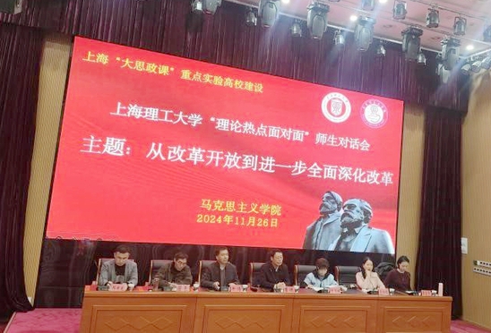 为深入学习贯彻党的二十届三中全会精神,推动党的创新理论深入人心、见行见效,马克思主义学院于11月26日晚上在国合楼三楼报告厅开展“理论热点面对面:从改革开放到进一步全面深化改革”师生对话会,引导学生感悟党的二十届三中全会精神、增强对新时代新征程改革发展方略的理解和认同。上海市学习贯彻党的二十届三中全会精神宣讲团成员、上海市改革创新与发展战略研究会会长、市委宣传部原副部长李琪教授,管理学院李正明教授,马克思主义学院院长金瑶梅、副院长牛海、梁豪副教授、邢中先博士、宗立宁博士和三百多名学生参与本次对话会。这次活动也是学校推进上海“大思政课”重点实验高校建设的重要内容。