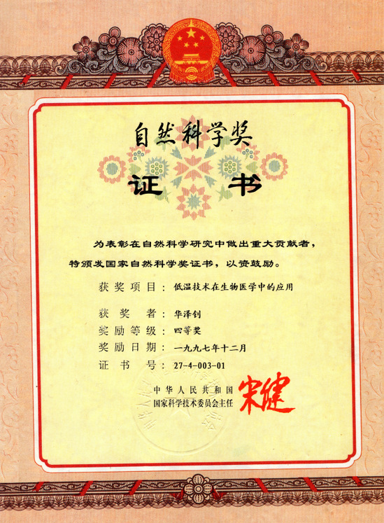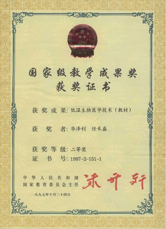 不久之后,华泽钊迎来了他的高光时刻。1996年,华泽钊以“低温技术在生物医学中的应用”课题申报机械工业部科技进步奖二等奖,结果却评上了一等奖。第二年,该课题又在一、二等奖空缺的情况下获得国家自然科学奖四等奖。同时围绕这一课题编写出版的教材《低温生物医学技术》,也在1996年获上海市优秀教材一等奖,1997年获国家级教学成果奖二等奖。一个厚积薄发的课题,一时间四喜临门。