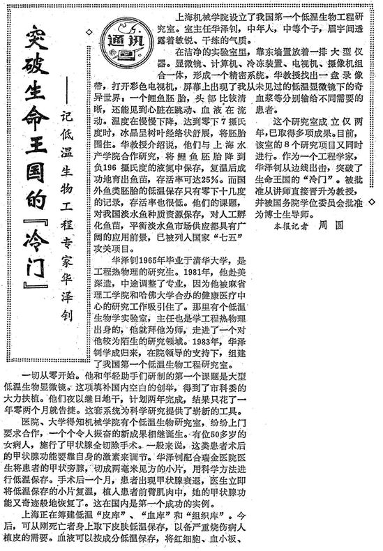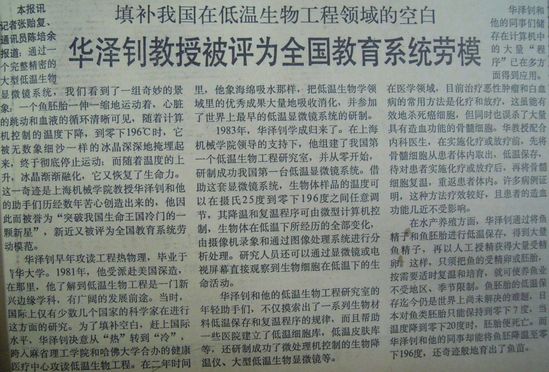 次年,华泽钊领衔承担的“大型低温显微镜”项目获得了1987年度上海市科技进步奖二等奖。《文汇报》《光明日报》先后以《突破生命王国的“冷门”——记低温生物工程专家华泽钊》《填补我国在低温生物工程领域的空白》为题,对华泽钊取得的研究成果作了专题报道。