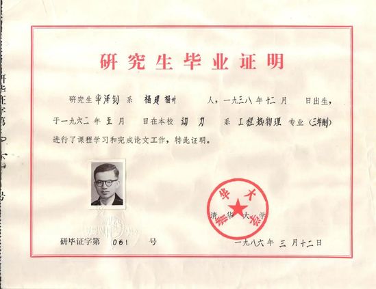 在党中央提出“向科学进军”口号的1956年,华泽钊考入清华大学动力机械系。在清华园,华泽钊度过了6年本科和3年研究生学习生涯,专业方向是工程热物理和热能工程。