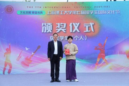 开幕式上,还对一年来国际学生中各类获奖者、优秀志愿者以及活动积极分子进行了表彰。盛春副书记、研究生院院长崔国明、学生处处长何炉进、团委书记刘威、国际交流处副处长徐璟玮、沪江学院副院长梁昱、朱慧锋分别为获奖学生颁发了证书,以鼓励他们在文化感知和志愿服务等方面的积极贡献。