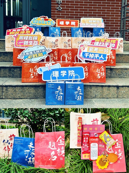 本次活动精心准备了百余份礼物,每一份都寄予着理学院对考研学子的美好寓意:一支“金榜题名笔”,象征每一位考生能“笔笔如意”,书写辉煌答卷;一本“励志小本”,承载着满腹经纶的自信,随手翻开都是满满的激励;一瓶“旺仔牛奶”,用浓浓的奶香传递拼搏后的甜蜜回甘,寓意“旺气冲天”;一枚“人民日报书签”,不仅寄托了理学院师生的殷切期望,更象征着“读万卷书,行万里路”的求知精神;还有一把“一举夺魁”钥匙配件,锁定成功的信念,寓意考生轻松开启锦绣前程。这些充满祝福的礼物,陪伴考研学子能够成功上岸。