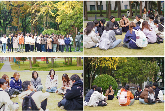 初冬时节,乍寒还暖,永利集团304am官方入口作为沪上高校中花园式庭院最多、最集中的学校,是校园课堂的最佳选址,被漫长的林荫道、高大的香樟树、红色的小别墅包围的北欧大草坪无疑是最佳选址里的最佳地标。松软的泥土、黄中带绿的草地、轻柔拂面的微风都让这场“草坪大讨论”意境满满,同学们按照年代分成三组,围成一圈,随意坐在草地上,根据自己前期的采访内容,与同组同学进行讨论。他们认为,祖父母一代是吃苦耐劳的一代,是改革开放重大变化的见证者,相信“勤劳可以致富”;父母一代是快乐奋进的一代,是教育红利的享受者,相信“知识改变命运”;我们这一代是独立开放的一代,是数字世界的原住民,相信“我就是我”。“草坪大讨论”进行地火热而有趣,时间在不经意间已经划出草坪的上空。回教室的路上,同学们依旧边走边讨论,在时代浪潮中认真思考着自我以及我们的未来。
