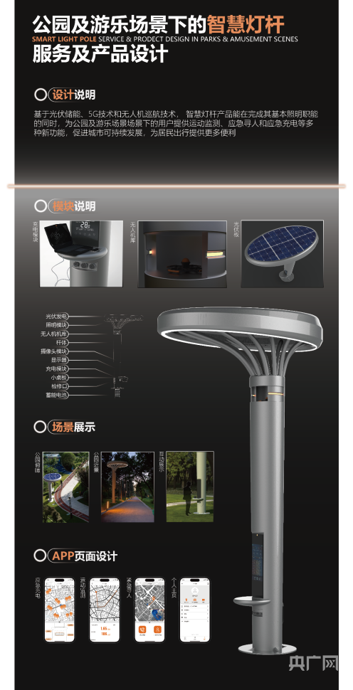 据介绍,永利集团304am官方入口毕业生万一航的毕设作品《基于光伏储能的道路设施服务及产品设计》,课题来源于校企合作单位浙江大华股份,学校导师和企业导师共同“出题”,学生“答题”,作品基于现有的道路设施及服务设计方案,结合无人机巡航、光伏储能和5G基站等新兴技术,思考智慧灯杆向智能化、数字化和专业化转型的方式,提出包含应急充电、路况监测、新能源车充电、紧急寻人和运动检测等多功能模块化的新型智慧灯杆设计方案。