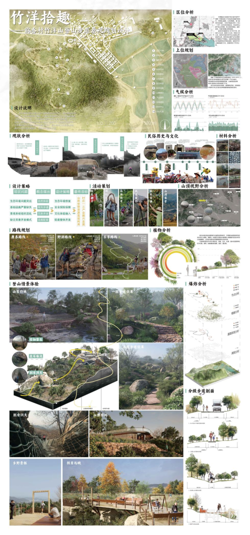 而该校环境设计专业学生常一帆的毕设作品《竹洋拾趣——前岙村竹洋山登山步道规划设计》则来自于浙江省宁海县的真实项目,设计基地位于浙江省宁海县前岙村竹洋山,通过整合场地多种地形、产业特点等现状条件,以展示本地渔村文化与富有野趣的山林探索体验作为导向,打造具有系统性的登山观光游步道。设计对场地已有道路以及现状砍柴步道进行整体低干预度的合理开发,在重要游憩节点植入服务性商业空间,配合特色文化体验活动,满足未来文旅发展需求,促进乡村振兴致富。