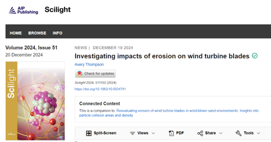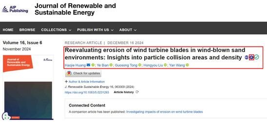 近日,能源与动力工程学院创新团队成员黄豪杰及其合作者在美国物理学联合会出版社杂志《可再生与可持续能源期刊》(Journal of Renewable and Sustainable Energy)发表题为《重新审视风沙环境下的风力机叶片侵蚀:颗粒碰撞区域和密度的洞见》(Re-evaluating Erosion of Wind Turbine Blades in Wind-blown Sand Environments: Insights into Particle Collision Areas and Density)的研究论文,该研究成果被《可再生与可持续能源期刊》选为Featured (Editor's picks)文章(见图1),并被美国物理学联合会(AIP)Scilight专题报道(见图2)。本文第一作者和通讯作者为永利集团304am官方入口能源与动力工程学院黄豪杰老师,永利集团304am官方入口2022级硕士研究生卞叶、永利集团304am官方入口2023级硕士研究生仝郭松、兰州大学刘洪佑博士和兰州理工大学王燕教授为共同作者。该研究成果获得上海市自然科学基金(No.24ZR1453300)、国家自然科学基金(No. 12002119, No.52276197)的资助。