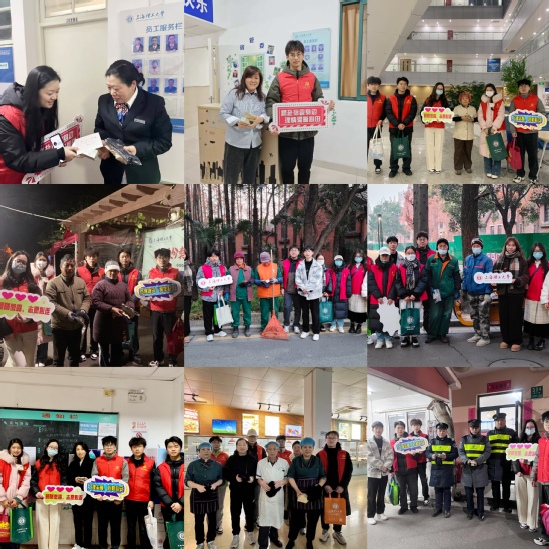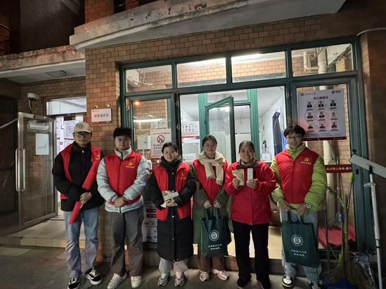 黎明未破晓,万籁俱寂之时,志愿者们便已身披红马甲,齐聚于学校南北区门口。他们分为五支队伍,从军工路334号、516号、580号校门出发,沿着规划的路线前往各个后勤保障岗位。他们顶着凛冽的寒风,怀揣着一颗颗滚烫的心,为门卫大叔、宿管阿姨、保洁工人等辛勤工作的基层劳动者送去御寒的手套、帽子、护手霜和暖胃的姜茶。