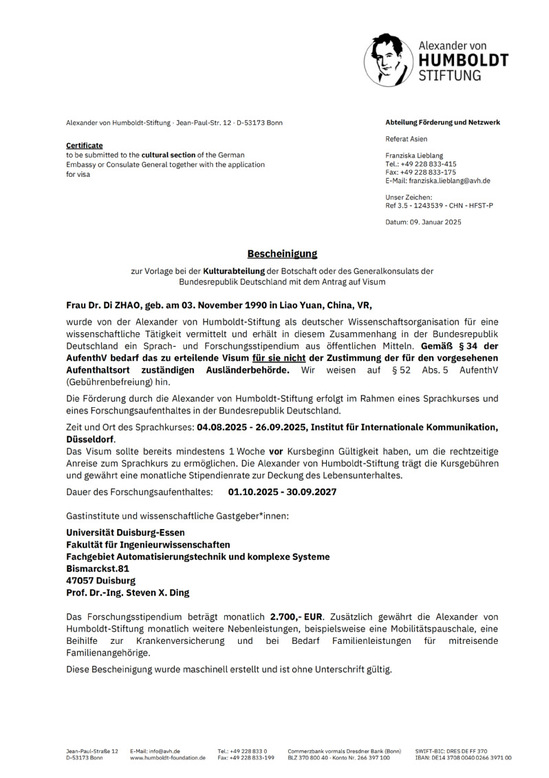 1月9日,德国洪堡基金会(Alexander von Humboldt Foundation)发来正式授权信,管理学院系统科学系副研究员赵迪入选德国洪堡基金会“洪堡学者”,获得德国洪堡基金会资助与“洪堡学者”(Humboldt ResearchFellowship)荣誉称号。该项目的邀请合作方为德国杜伊斯堡—埃森大学(University of Duisburg-Essen)教授Steven X. Ding。