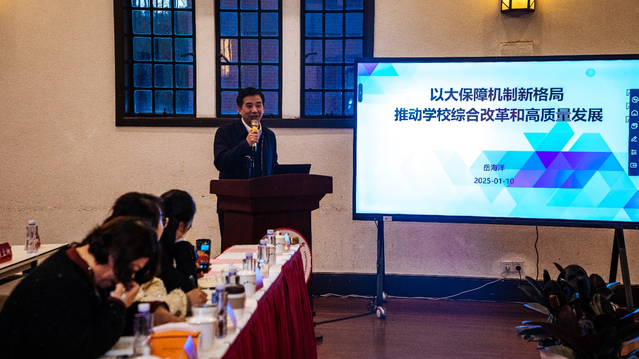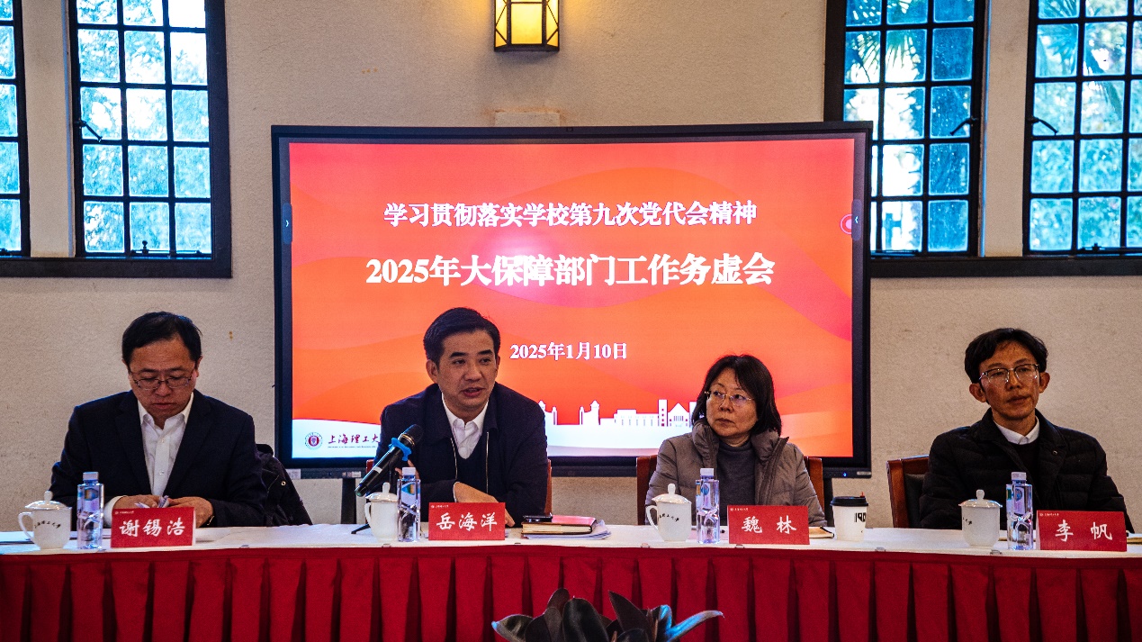岳海洋对各部门为学校保障工作的辛勤付出表示肯定,并作以“以大保障机制新格局推动学校综合改革和高质量发展”为题的总结讲话。他要求与会部门负责人和教职工要全面领会上级有关文件和会议精神,深入学习贯彻改革方法论,做好党代会精神学习宣传贯彻工作,切实为学校全面深化改革贡献力量。他强调,要充分认识保障系统面临的机遇与挑战,作为上海市首批“高水平地方高校”建设试点单位和“双高”试点高校,要抢抓机遇,利用好复兴岛开发建设利好,深刻分析内生需求,明晰学校第九次党代会针对校园大保障工作所部署的任务,加快推进内部治理体系改革。他提出,要聚焦立德树人,以更加明确的目标和思路,建立更为高效的体制与机制、更为有效的载体和举措,进一步完善保障制度体系,做好队伍建设,实现提质增效,以实际工作成效回应师生对美好校园生活的关切与期待,为学校120周年校庆和“院为实体”改革做出保障部门应有的贡献。岳海洋还对2025年大保障部门重点工作进行了部署,并强调近期和寒假期间校园保障工作要抓紧抓实,要守牢安全底线,确保校园总体稳定。