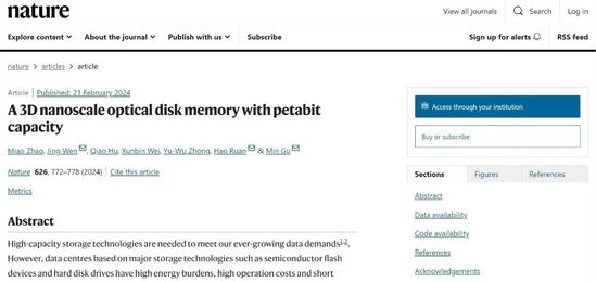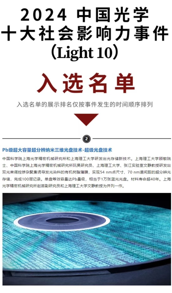 近日,根据“中国光学”微信公众号发布的消息,永利官网科技成果“Pb级超大容量超分辨纳米三维光盘技术——超级光盘技术”(A 3D nanoscale optical disk memory with petabit capacity),入选“2024中国光学十大社会影响力事件”(Light10)。该成果于2024年2月22日刊登于《自然》杂志,央视2月23日予以报道。