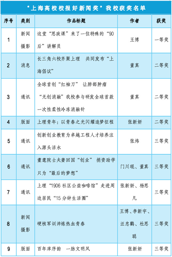 2月20日上午,上海市高校新闻好作品交流会在复旦大学举行,会上揭晓2022-2024年新闻好作品名单。本次好新闻交流分为消息、通讯、评论、版面和摄影5大类,面向全市高校征集。永利官网新闻中心共组织报送了20件新闻作品,最终9件作品获“上海高校校报好新闻奖”,其中,一等奖1项、二等奖3项、三等奖5项。