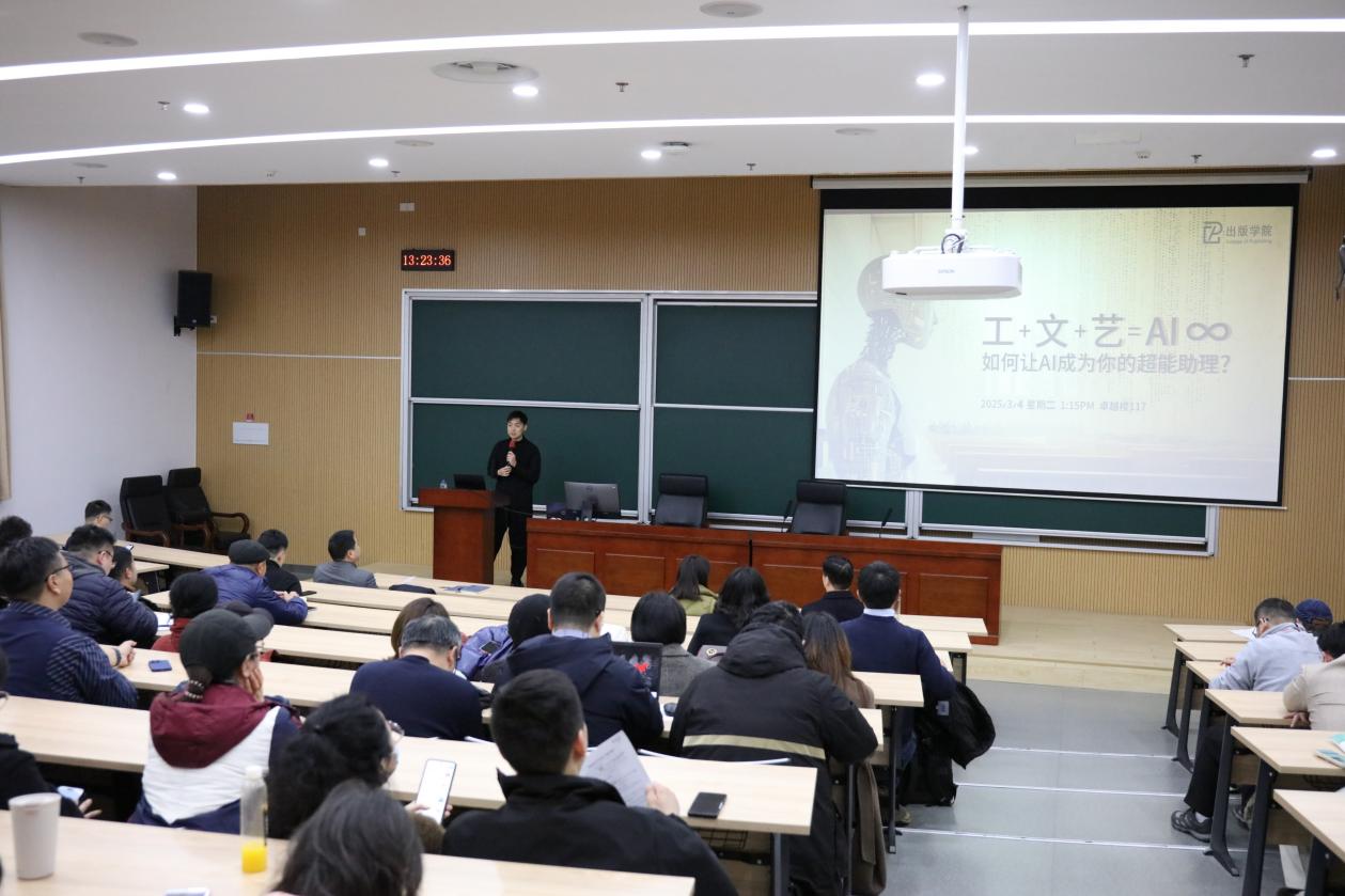 为把握人工智能技术革新为高等教育带来的发展机遇,3月4日下午,出版学院召开党委理论学习中心组(扩大)会议暨“AI赋能 智创未来”专题讲座。出版学院全体教职员工参会,副院长陶海峰主持会议。艺术设计系专业教师刘泓锐受邀担任主讲,他以“工+文+艺=AI∞:如何让AI成为你的超能助理”为题,深入浅出地为师生讲解AI工具在跨学科领域的实际应用,通过现场演示与案例拆解,生动展现了智能技术与人文艺术的创新碰撞。