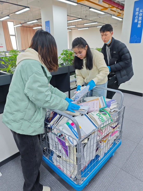 图书馆馆员首先为志愿者们概述了图书馆的馆藏现状,其后详细介绍了图书、期刊、毕业论文等纸质馆藏文献和自修室的管理流程以及服务规范。随后,学生志愿者分组投入到图书馆流通部、期刊部、信息部及南校图书馆等相关部门的志愿活动中:擦拭书架和桌椅,进行卫生清洁,保持图书馆馆舍干净整洁;整理图书和期刊,将乱序图书按照索书号排序,方便师生查找资料;回收自习位无人认领图书,把收纳区还给有需要的读者;毕业论文整理上架,年度期刊下架装订,协助文献归档保存……志愿者们齐心协力,有条不紊地完成了各自任务,以实际行动践行了雷锋精神。