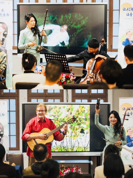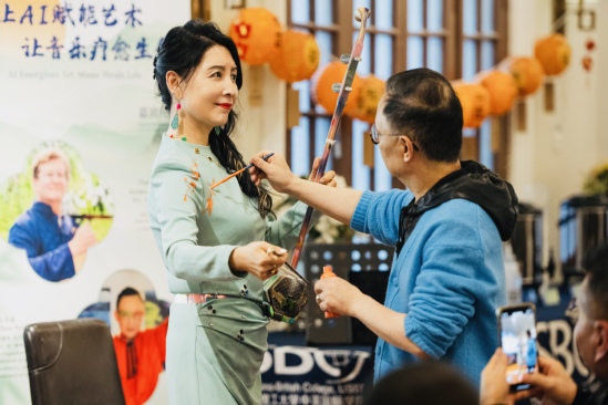 3月14日下午,中英国际学院迎来了一场艺术与科技交融的视听盛宴——著名二胡艺术家马晓辉携手她的嘉宾朋友们,以“让AI赋能艺术,让音乐疗愈生命”为主题,带领观众探索音乐与人工智能的跨界可能。中英国际学院党委副书记、副院长蔡卉,以及师生代表们共同参加本次活动。