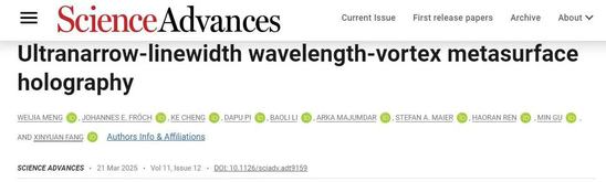 这项研究的背后,是一支横跨三大洲的科学联合团队,由上海理工牵头,澳大利亚莫纳什大学、美国华盛顿大学等机构的专家们跨越时区壁垒,云端协作攻克技术难关。通过“虚拟实验室”共享实时数据,利用跨国设备接力完成超表面制备与测试。“就像用全球智慧拼出一张完美全息图,”方心远研究员感慨道。这种无国界科研模式,不仅验证了超窄线宽超表面全息作为光学密码锁的可行性,更凸显了国际合作在科研中的重要性以及在重大科研突破中体现的中国主导力。