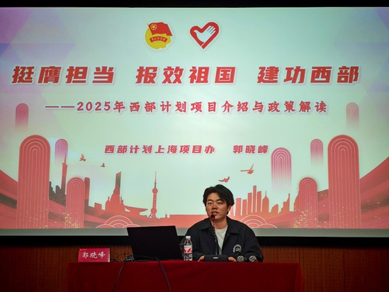 宣讲会由校团委挂职副书记李文翔主持,邀请了西部计划上海项目办的郭晓峰对2025年西部计划项目进行介绍与政策解读。作为曾经服务于重庆的西部计划优秀志愿者,郭晓峰首先结合亲身经历讲述了在西部基层工作中的成长与收获,展示了服务地的风土人情和感人故事。随后,他详细介绍了2025年西部计划的报名条件、招募流程、服务内容以及保障机制,并重点解读了生活补贴、考研加分、机关事业单位考录、工龄计算等方面的相关政策,让同学们对西部计划有了更清晰、更全面的认识。“用一年的时间,做一件终身难忘的事。”这句话深深触动了在场的每一位同学。