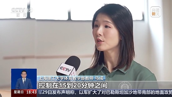 开合跳、高抬腿、摸地深蹲跳。在这堂“热辣滚烫”的健康减脂课上,体育老师马成正指导学生进行高强度间歇训练。运动结束后,还会实时监测学生心率和血氧饱和度,确保锻炼强度安全有效。