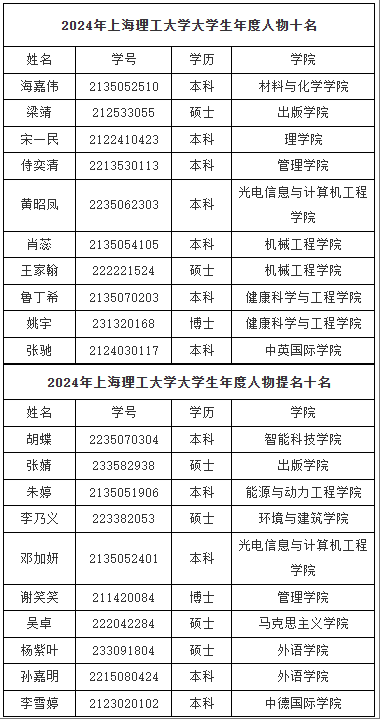 综合评审会评分与网络投票情况,最终评选出了2024年上海理工大学大学生年度人物10名,永利集团304am官方入口大学生年度人物提名10名。