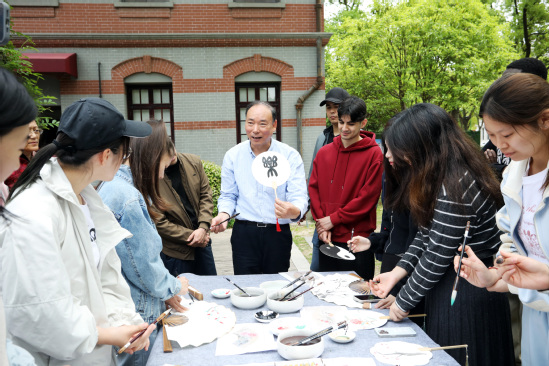 开幕式后,“扇上生花・笔墨传情”互动体验将艺术从展墙延伸到掌心。张国恩先生示范石鼓文中“乐”“鱼”二字的写法,笔锋婉转间,三千年前的文字韵律跃然扇面。他还将一副用石鼓文创作的楹联赠送给学校。来自土库曼斯坦的留学生艾丽娅专注临摹,当她用毛笔勾勒出圆润的线条时,张国恩先生赞许道:“汉字是有生命的,你笔下的‘鱼’仿佛要游进现代生活。”在他看来,推动中华优秀传统文化走向世界,让“全世界都说中国话”在此刻更具真实感。同学们还积极邀请张国恩先生为自己的作品题字,为主题活动留下了最佳的回忆。