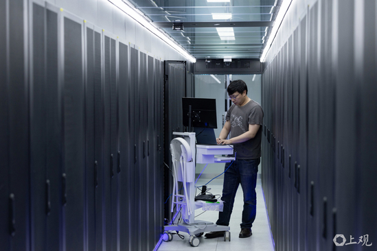 复旦大学研究人员在中国高校规模最大的云上科研智能计算平台进行设备调试