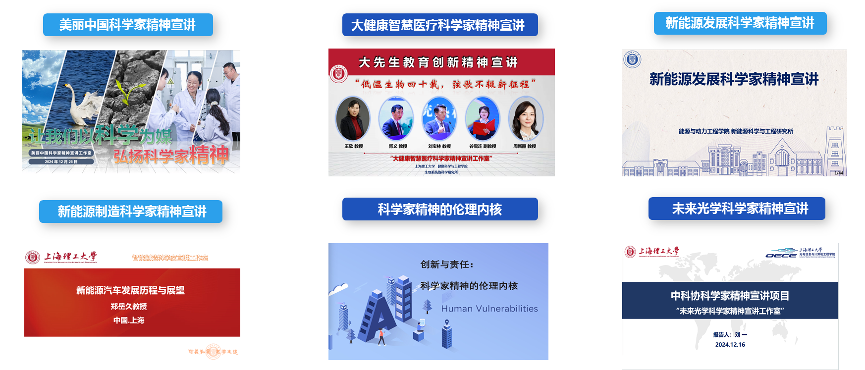 2024年永利官网“弘扬科学家精神 培养卓越工程人才”首次获批中科协科学家精神宣讲项目。立项后学校高度重视,在全校范围里梳理和整合资源,开发了6门宣讲课程,分别是未来光学科学家精神宣讲、新能源发展科学家精神宣讲、大健康智慧医疗科学家精神宣讲、智能制造科学家精神宣讲、美丽中国科学家精神宣讲、科学和工程伦理科学家精神宣讲。由3名院士、16名教授、9名副教授等28人组成的宣讲队伍进行主讲。为确保组织有力,学校成立6个子项目工作室推进落实相关工作,工作室均由院士或子项目所在学院分管副院长担任工作室负责人,遴选宣讲团队、开发课程大纲、撰写讲解文本、制作PPT。经过历时10个月,由上海市科协和学校党委宣传部、马克思主义学院专家指导下的多轮打磨,课件日臻成熟,并录制成慕课,便于广泛传播课程内容。