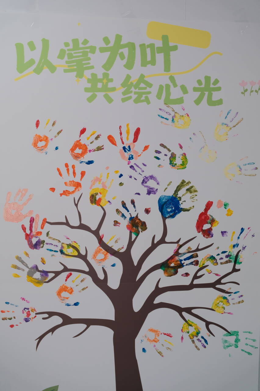 学生以手掌为笔,共绘“心灵树”巨幅画卷。深蓝墨绿交织成扎根大地的根系,象征青年脚踏实地的担当;明黄橙红晕染出破云的曙光,传递蓬勃向上的力量。沾着银灰颜料的手掌此起彼落,完成了这场集体创作。