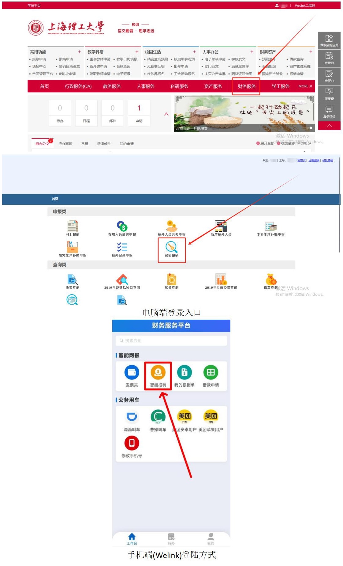 从学校官网首页右上方【信息门户】入口访问→【财务服务】→点击【智能报销】进入;移动端Welink中,搜索 【财务平台】→点击【智能报销】进入。