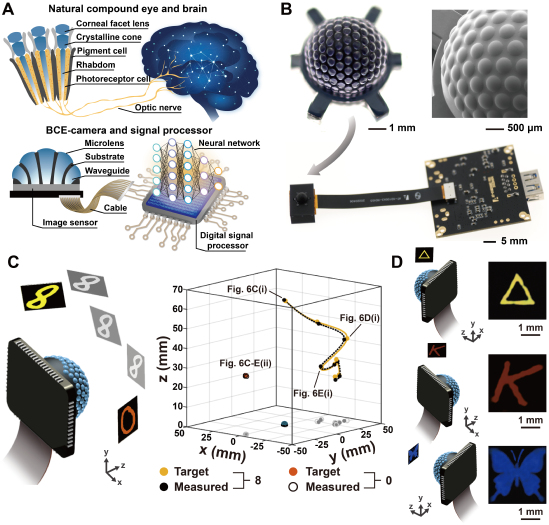 仿生视觉系统及成像效果。A 节肢动物视觉系统和仿生视觉系统;B 仿生复眼及视觉系统的实物图;C,D利用仿生视觉系统进行目标成像和定位