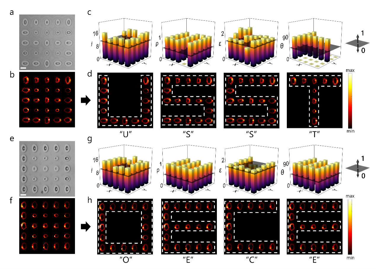 为突破这一限制,研究人员通过在法布里-珀罗微腔内创建介电椭环阵列,实现了椭圆光子轨道角动量模式阵列的产生以及多维加密,加密维度包括椭圆光子轨道角动量模式的角向阶数l、径向阶数p、椭偏度ε以及长轴方向θ。此外,因腔内等效光子势对微腔的高度敏感性,每个椭圆光子轨道角动量模式都表现出不可克隆性的激光图案。椭圆光子轨道角动量微腔激光器阵列的多维编码与不可克隆功能,构成了高度安全性的加密系统。