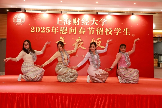 在上海财经大学的年夜饭现场,联欢会上精彩的表演与有趣的互动游戏引得师生们欢声笑语,留学生带来的缅甸传统舞蹈和多国语言合唱歌曲《两只老虎》趣味横生,带动了现场的节日气氛。“在这欢快的氛围之中,大家一同举杯,迎接新春的来临。这般亲切的互动令人倍感幸福,也让我深深体会到学校大家庭的温暖。”上海财经大学统计与数据科学学院2021级经济统计学专业的孙明骏说。