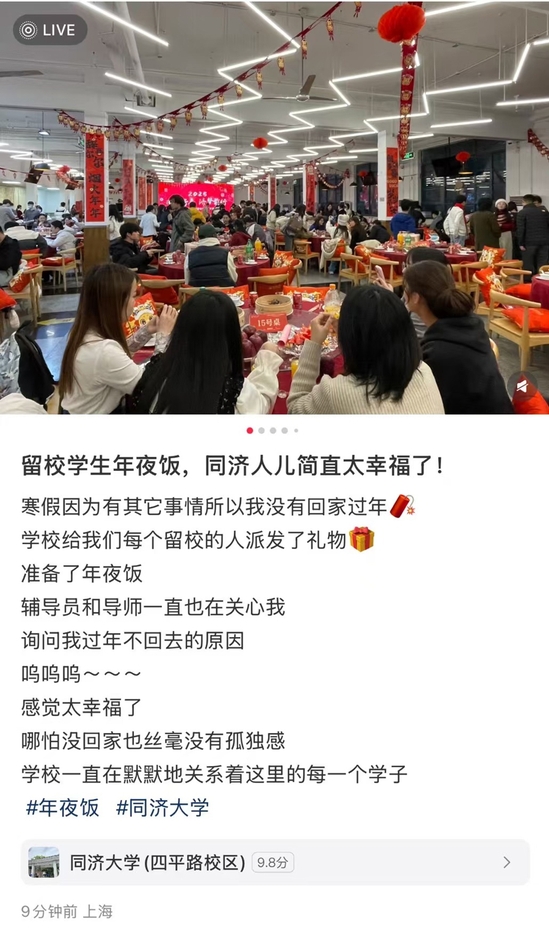 同济学子在小红书上发表自己在校吃年夜饭的感想