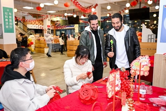 套圈、投壶、丢沙包、“钓蛇”……上海杉达学院的留校师生齐聚新春集市,重温儿时欢乐,分享幸福年味。俄罗斯留学生田妮是第三次在学校过春节,“每年学校都会安排活动,通过活动我又认识了新朋友,很开心。”猜灯谜、投壶、包饺子、做香囊等年俗活动更是吸引了不少上理工留学生一起参与,现场欢声笑语、热闹非凡,师生一同感受了传统节庆的文化氛围和艺术魅力。