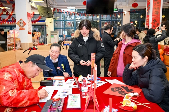 在这里,“迎新春·传统文化游园会”正在火热进行。一张红纸寥寥数剪成一幅窗花;一块面团一揉一搓,一个个面人儿跃然而生;做宫灯、写花鸟字、编制手链、画脸谱……食堂门口矫健活泼的舞狮表演更是为现场增添了欢乐洋溢的氛围。