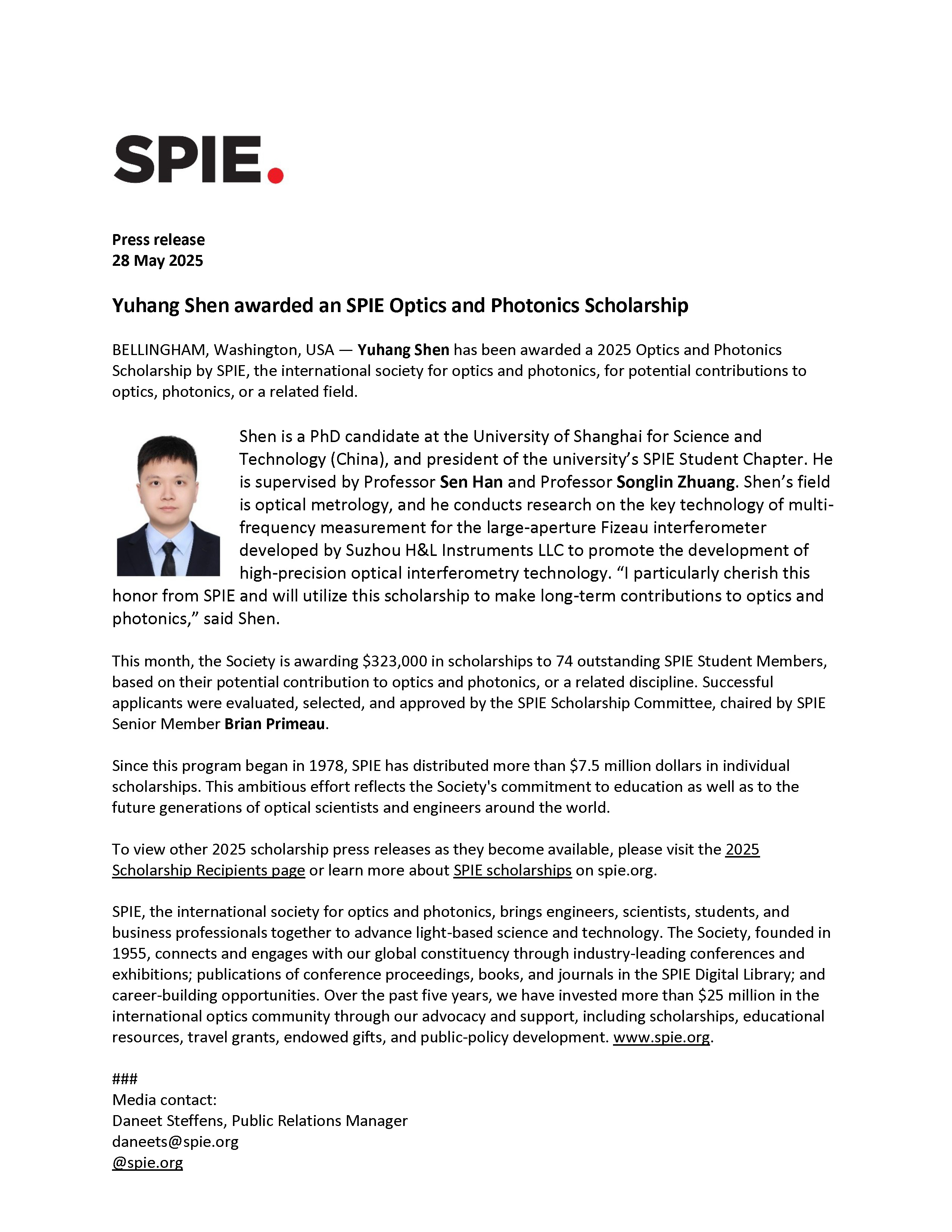 5月28日,SPIE(国际光学工程学会)向全球74名杰出的SPIE学生会员(中国学校共9名获奖者)颁发了总计323,000美元的奖学金,以表彰他们在光学和光子学或相关领域的潜在贡献。永利集团304am官方入口光电信息与计算机工程学院庄松林院士领导的韩森教授团队博士研究生沈宇航同学荣获SPIE光学和光子学奖学金。