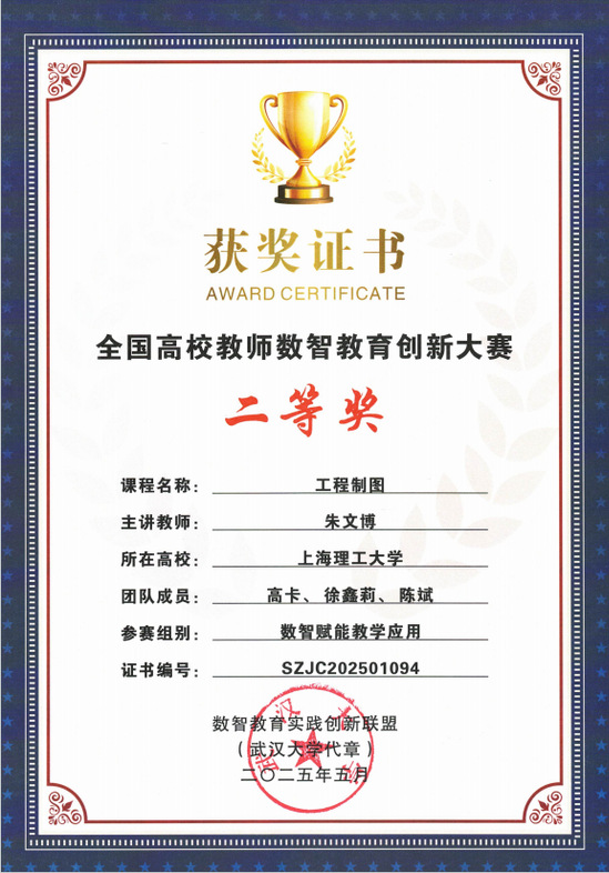 近日,首届全国高校教师数智教育创新大赛全国总决赛在武汉大学举行。上理工机械工程学院朱文博主讲的《工程制图》课程团队在数智赋能教学应用赛道中表现优异,荣获全国二等奖。